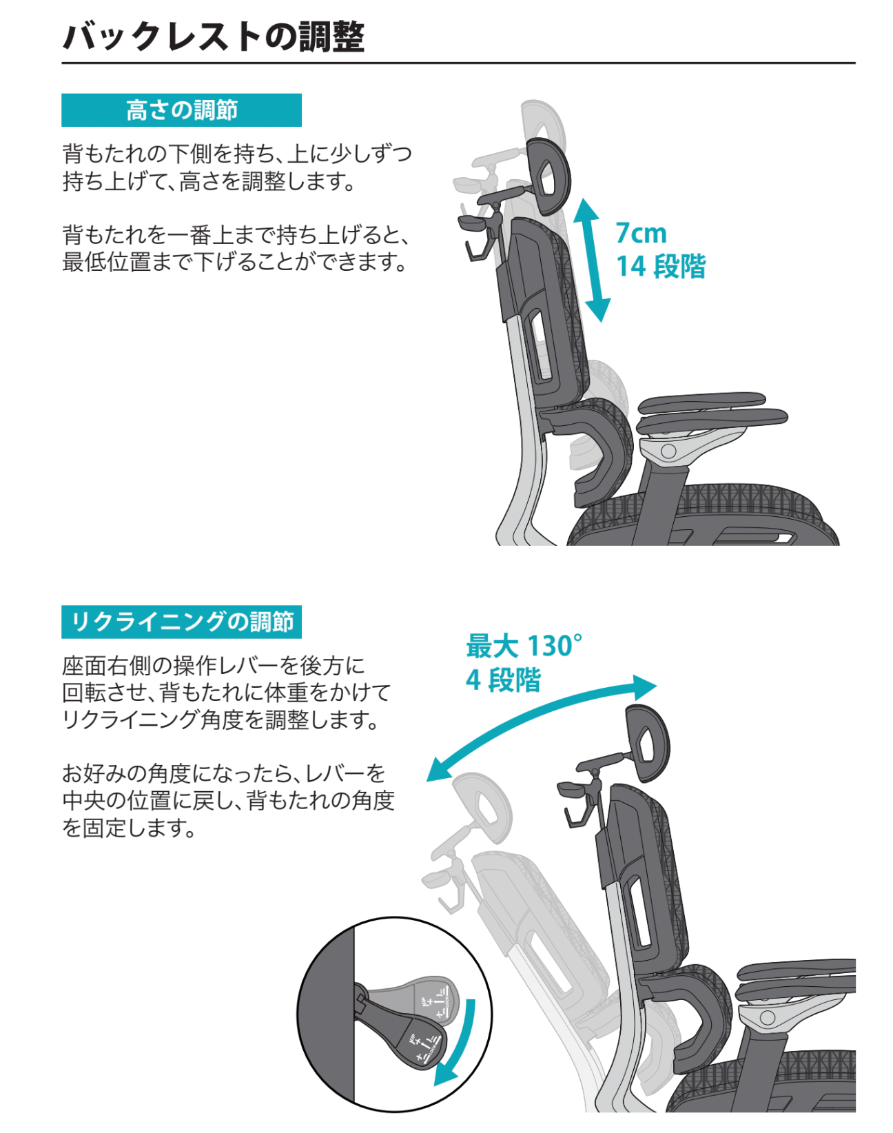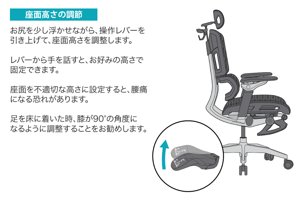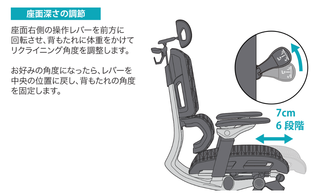 - ワンレバー操作:右手側のレバー1本で「座面高・座面スライド・リクライニング」をまとめて操作