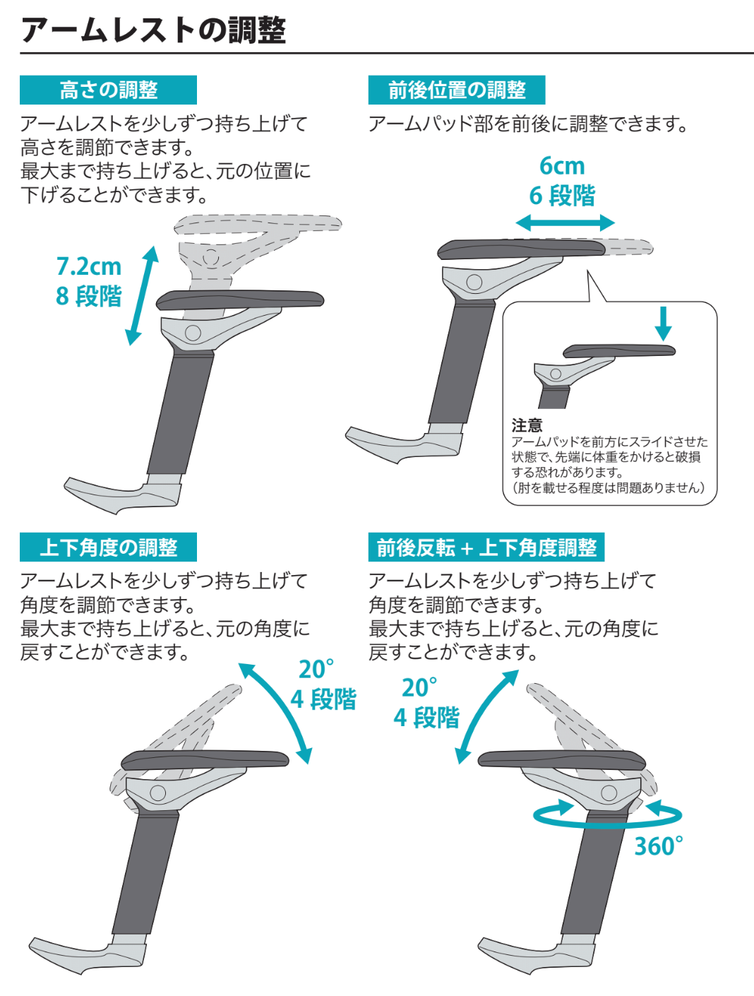 - 高さ8段/前後6段/上下角度調整20°/回転360°