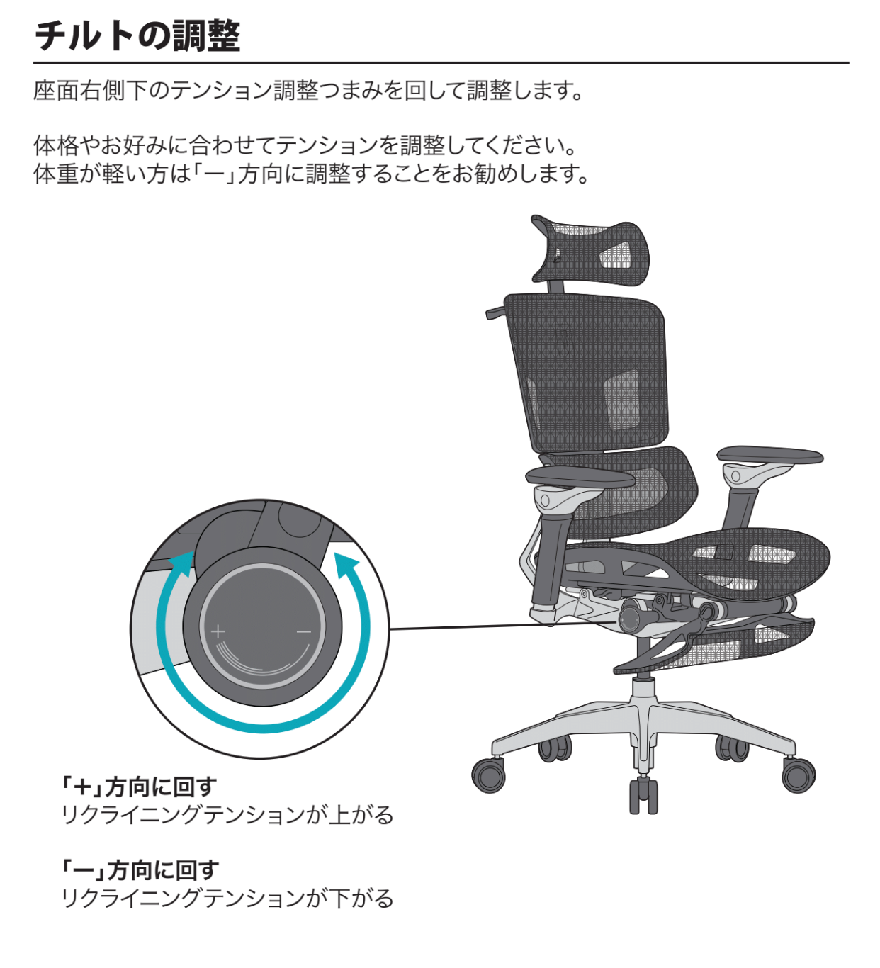 背もたれの反発が弱く、ロックしづらい | チルト反発を“+側”に回し、背を軽く押し戻すとロックしやすくなります。 |