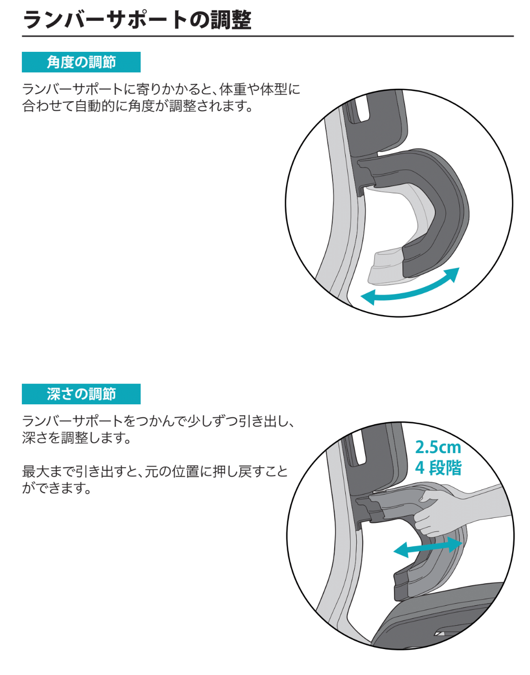 - 独立ランバーサポート:背もたれから独立して前後に動く腰サポート