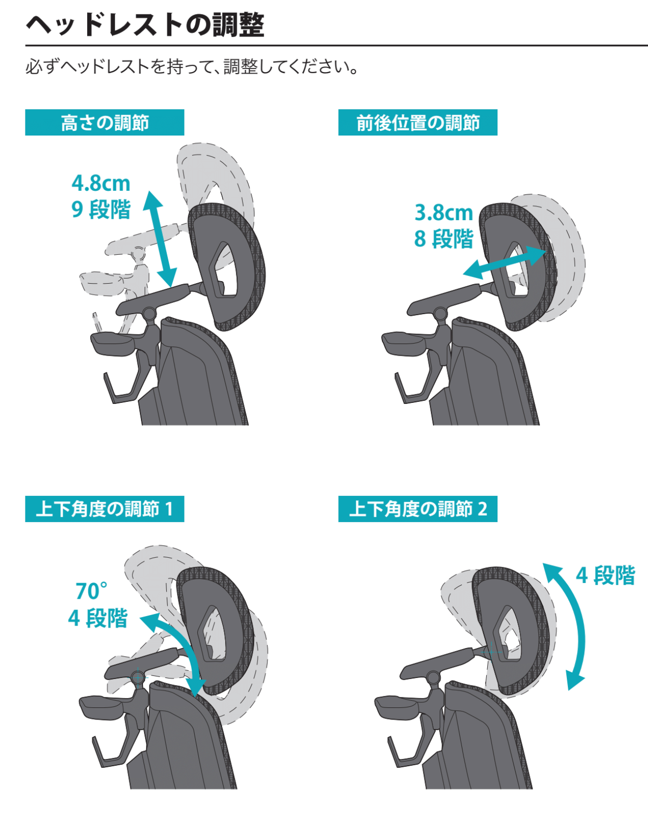 ヘッドレストが固定できない | 最大まで引き出すと一時解除。最小まで戻すと再固定されます。 |